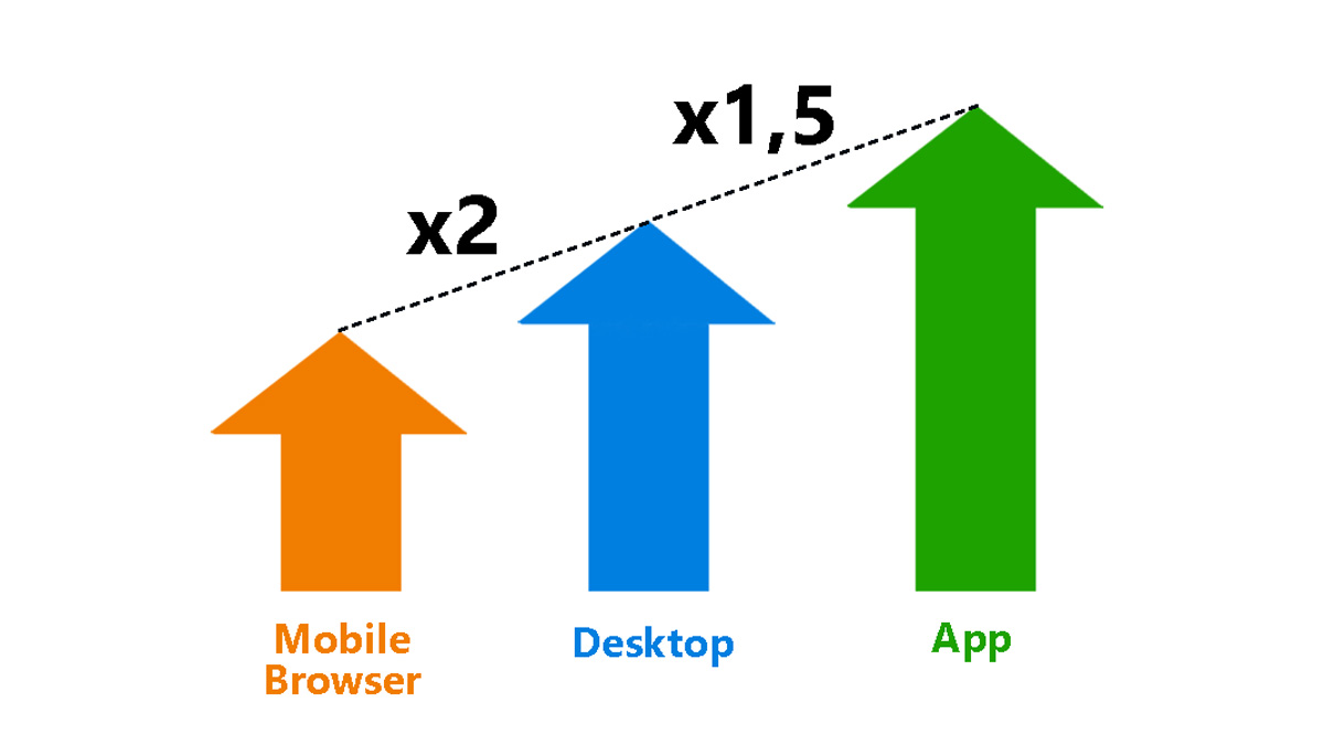 According to research by Criteo, mobile apps improve conversions. Since consumers use apps longer, they view 4.2x more products per session than mobile sites. More interestingly, apps drive potential customers further down the sales funnel, showing higher conversion rates compared to both mobile and desktop sites.